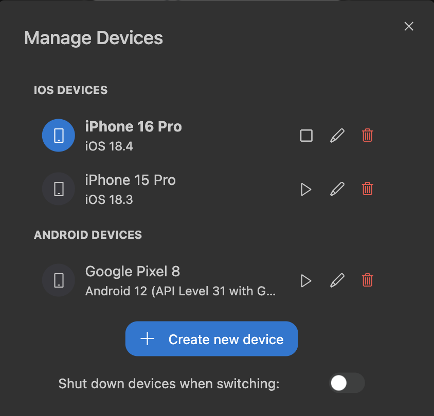 Radon IDE manages its own instances of Android emulators and iOS simulators separately from the ones you normally create with Xcode or Android Studio. Thanks to this architecture, you can easily add, update and remove devices you no longer need directly from the Radon IDE panel.